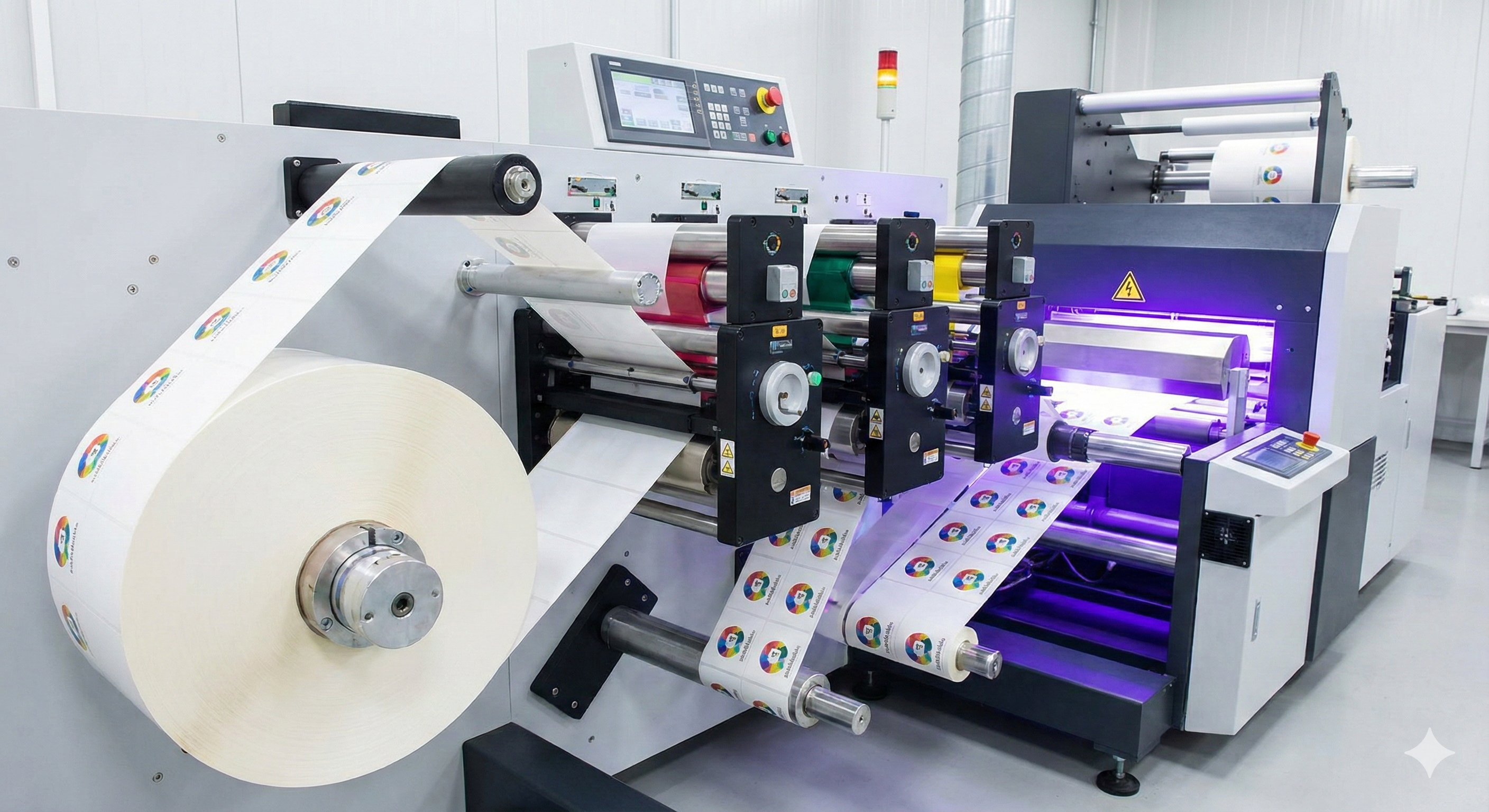 Hình ảnh cận cảnh máy in Flexo đang chạy tem cuộn, làm nổi bật khả năng in tốc độ cao và tích hợp hệ thống sấy UV, phù hợp cho các dây chuyền dán nhãn tự động.