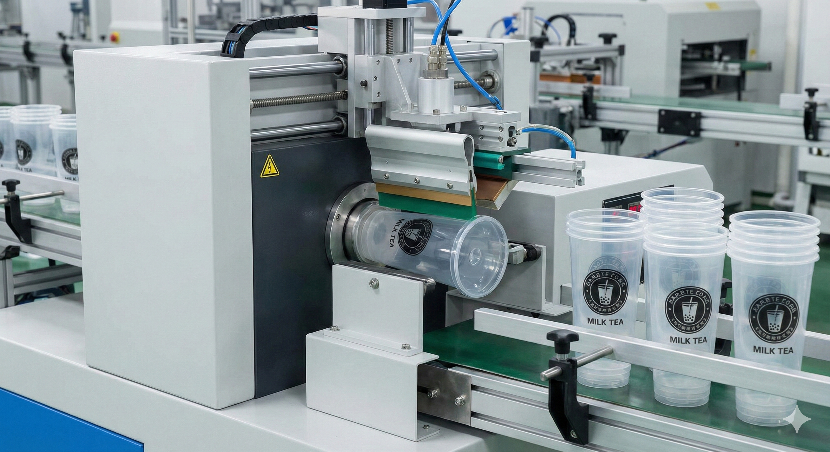 Hình ảnh này thể hiện rõ quy trình in logo trực tiếp lên ly nhựa trà sữa, một dịch vụ thế mạnh của An Bình, đảm bảo hình ảnh sắc nét và bền màu.